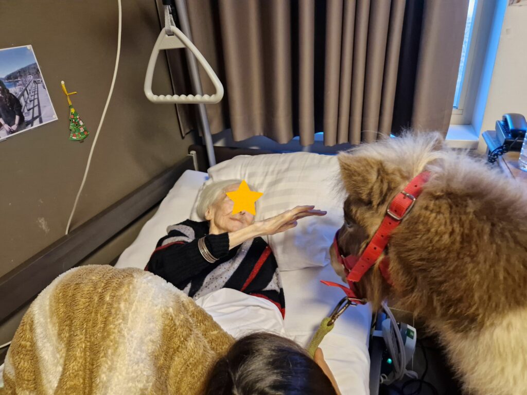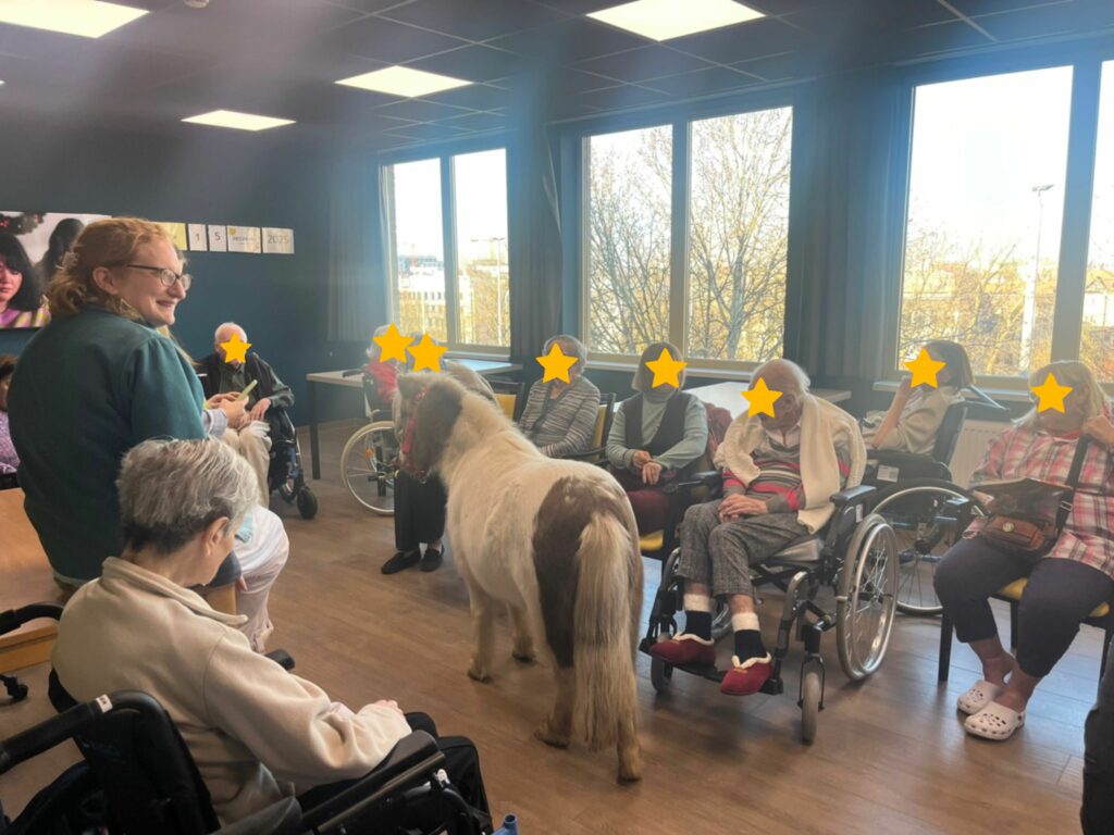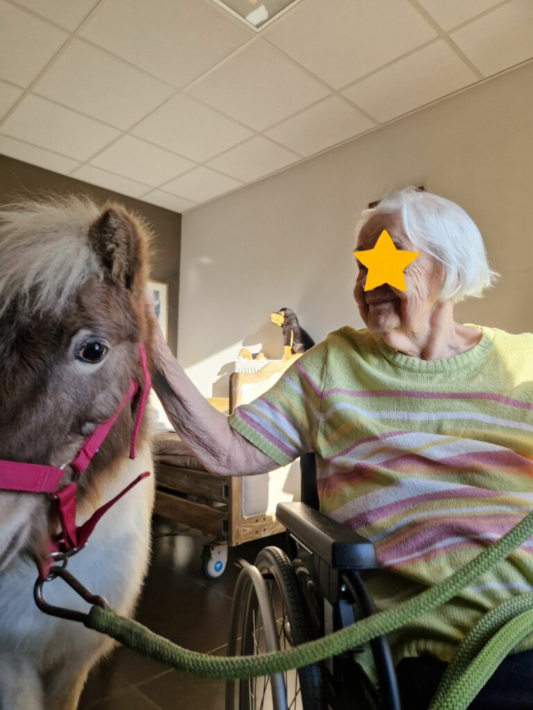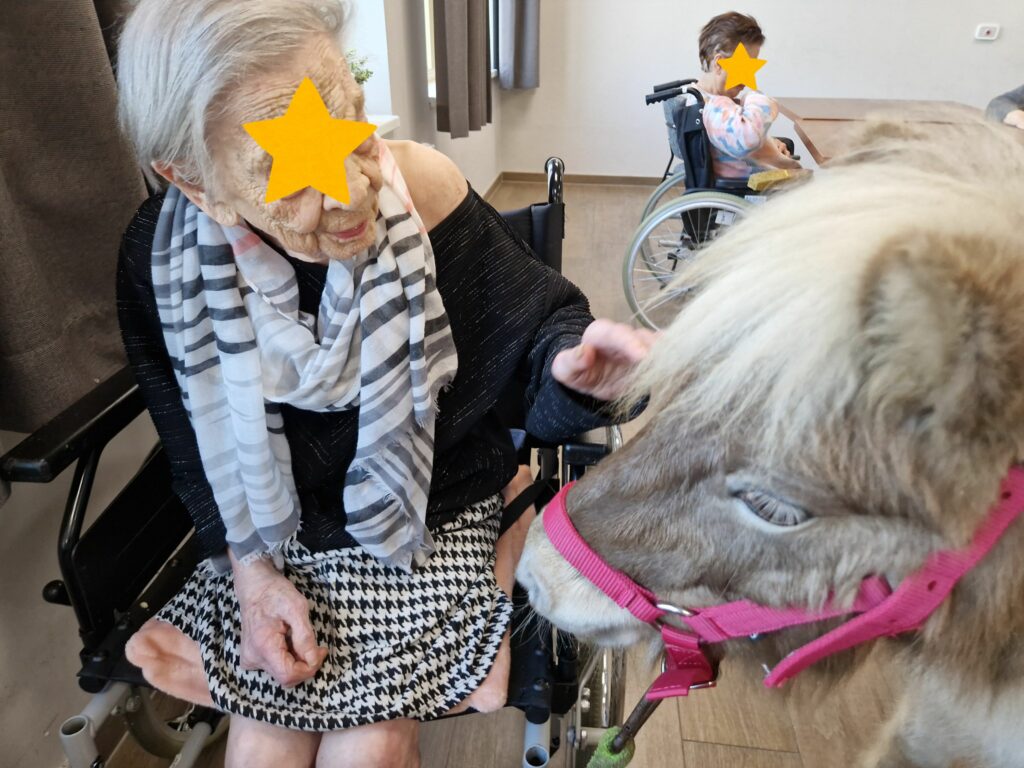 Parfois, se déplacer jusque chez nous peut-être trop compliqué. Je me déplace avec Mya, mon mini-cheval, pour des rencontres au plus près des personnes : en chambre, en salle commune, en extérieur ou lors de petites balades quand le contexte le permet. Ces visites peuvent se dérouler en groupe ou en individuel. Selon les besoins, nous co-construisons avec l’équipe le format, la fréquence et les espaces d’intervention, en intérieur comme en extérieur.